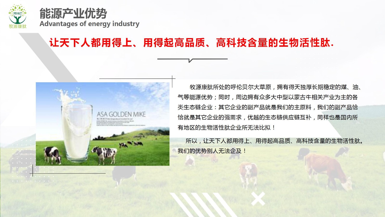 摘要:讓天下人都用得上、用得起高品質、高科技含量的生物活性肽.牧源康肽所處的呼倫貝爾大草原,擁有得天獨厚長期穩(wěn)定的煤、油、氣等能源優(yōu)勢;同時,周邊擁有眾多大中型以蒙古牛相關產業(yè)為主的各類生態(tài)鏈企業(yè):其它企業(yè)的副產品就是我們的主原料,我們的副產品恰...